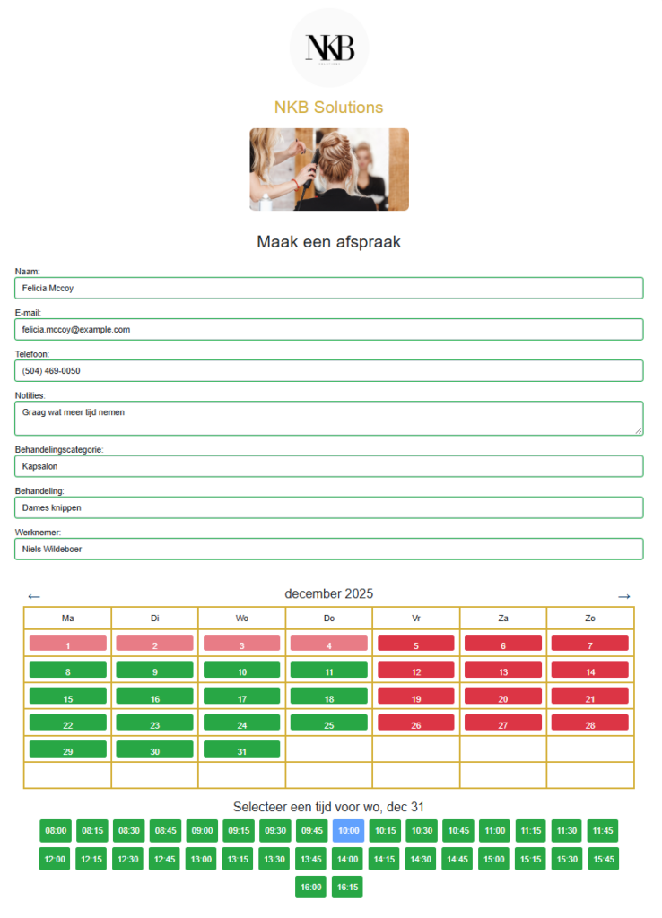 Maak een professionele indruk met een pagina die volledig in de huisstijl van je salon is aangepast, inclusief logo, kleuren en stijlelementen. - Beheer van afspraken